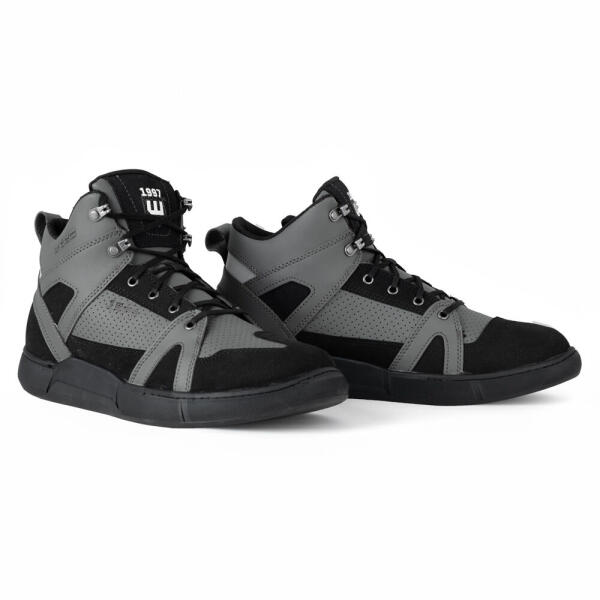 Motoros csizma W-TEC Milwook, megerősített területek, fűzős rögzítés, fém fűzőlyukak, ergonomikus talpbetét, fényvisszaverő elem, csúszásmentes talp szürke-fekete 46
